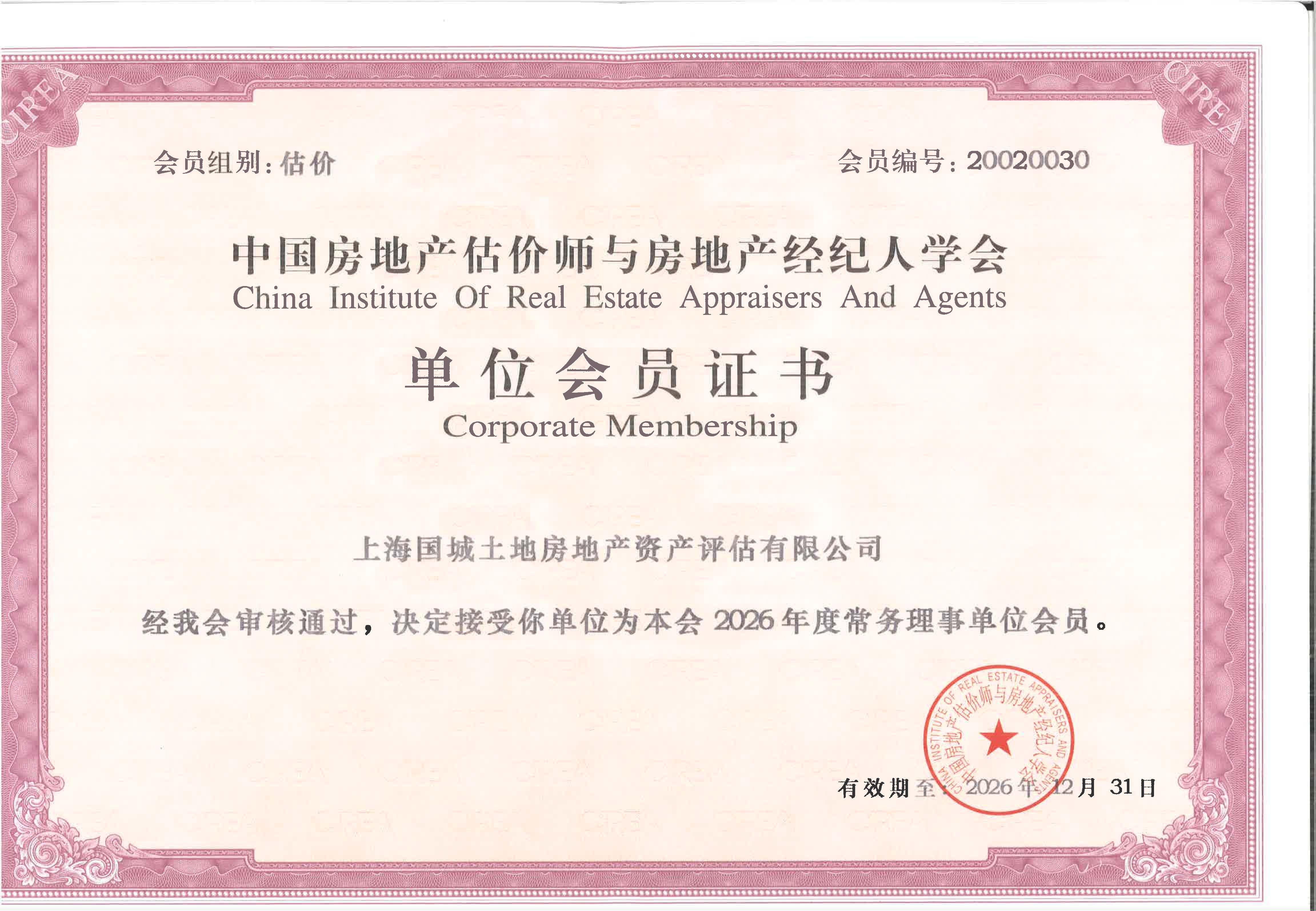 上海市房屋管理局备案的一级房地产估价机构证书