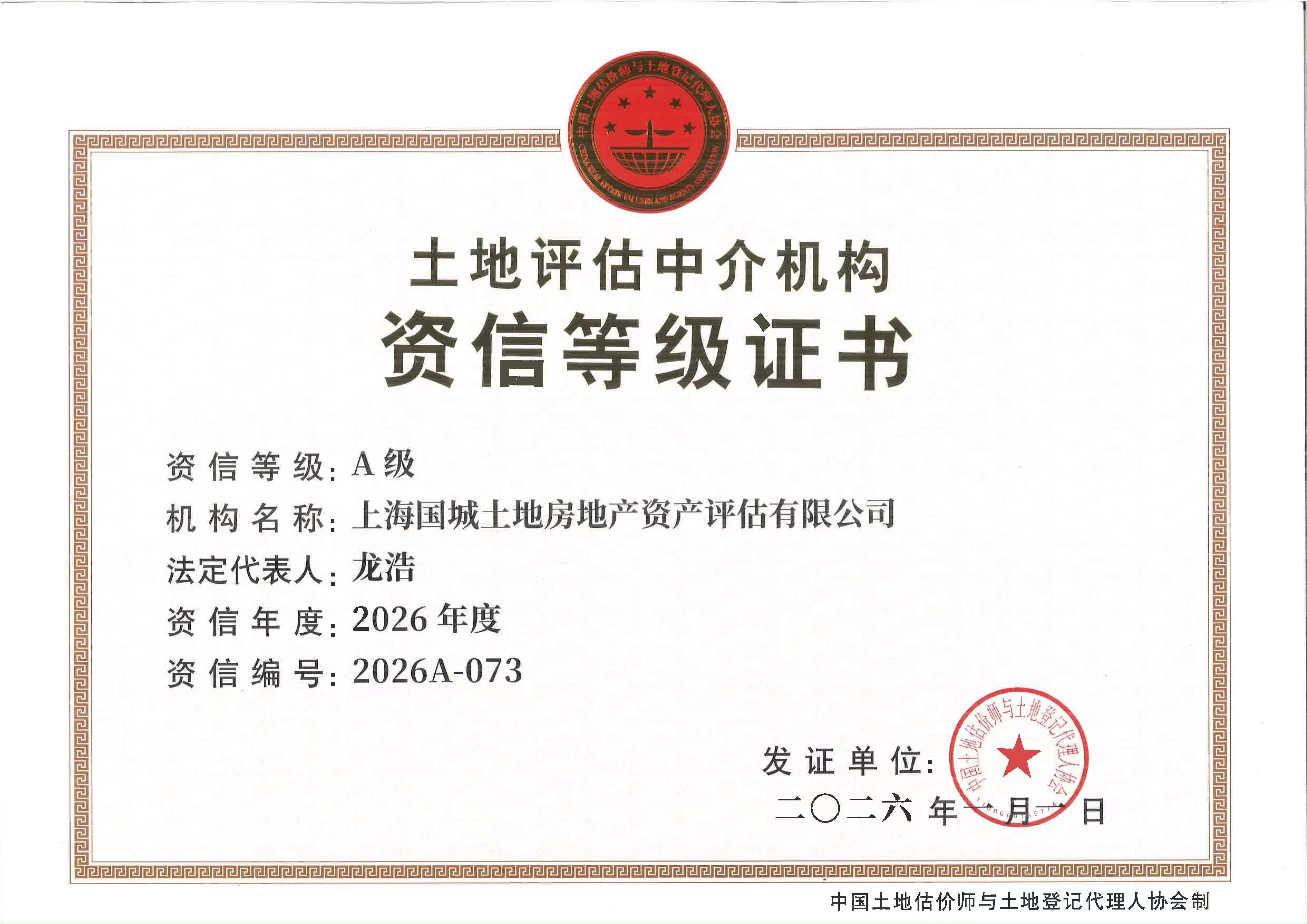 土地评估中介机构A级资信等级证书